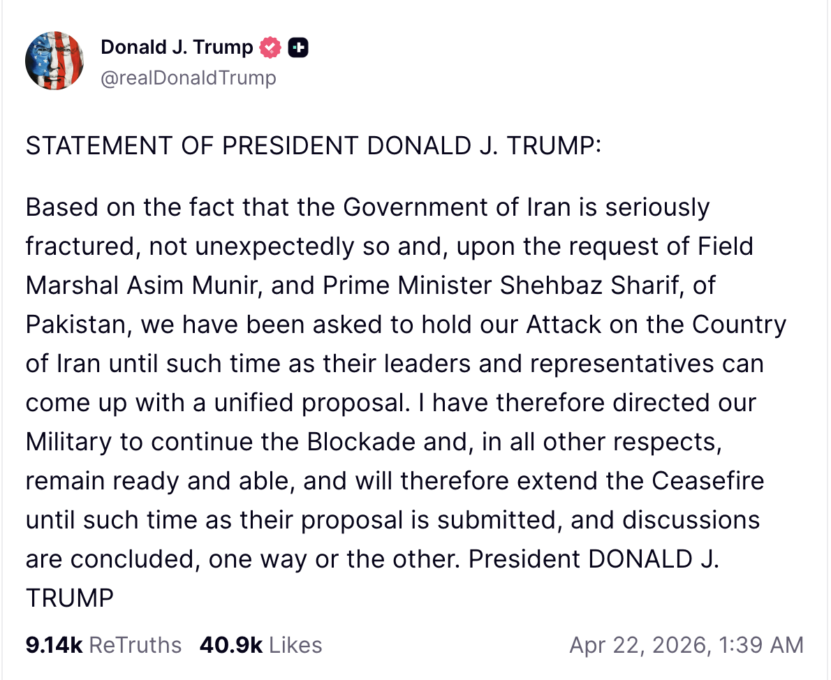 He said in Truth Social posts that Pakistan had asked the US to hold off on fresh strikes and that Washington would extend the ceasefire until Iran submits a new proposal and talks are concluded “one way or the other.”