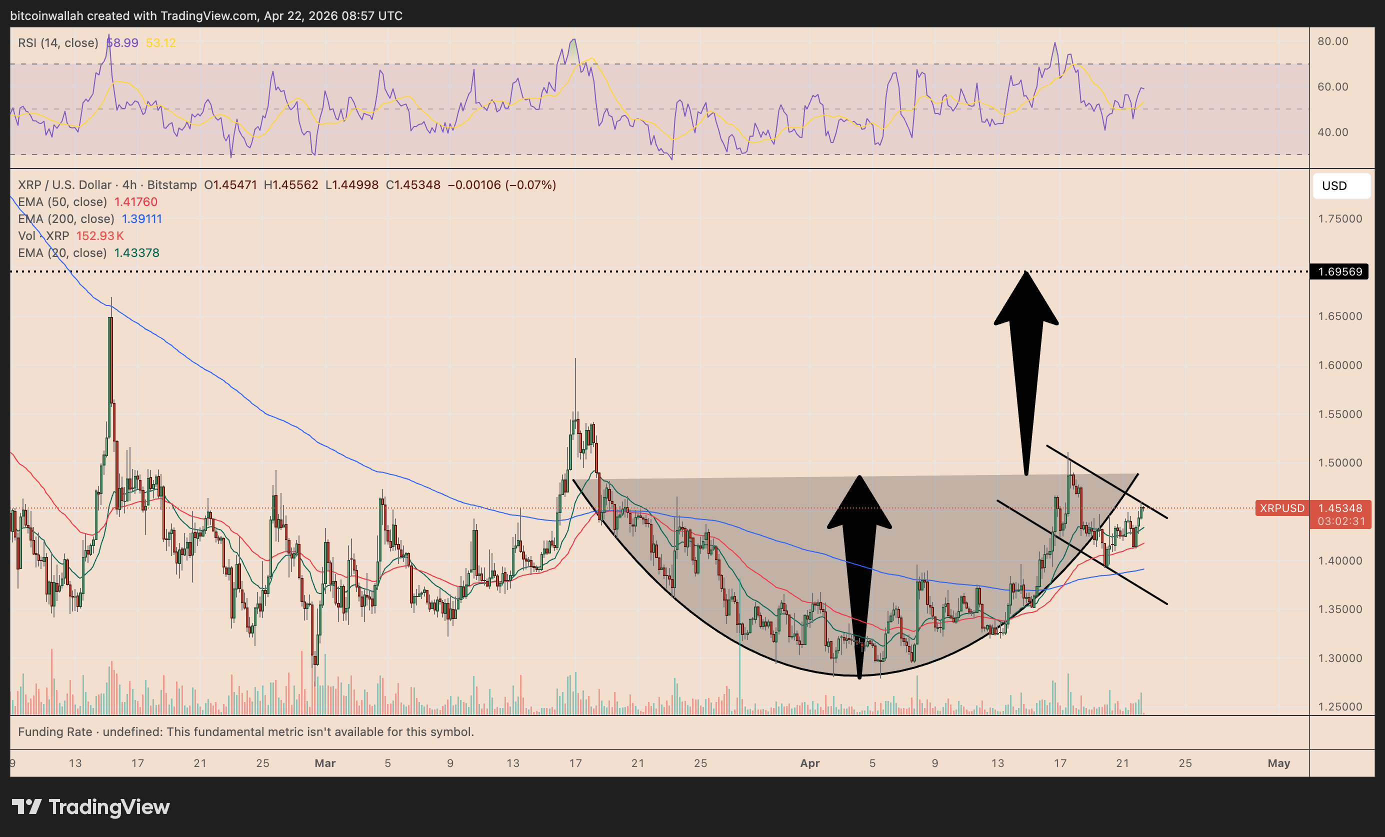 XRP appears to be forming a classic cup-and-handle pattern on the 4-hour chart, signaling a potential bullish continuation.