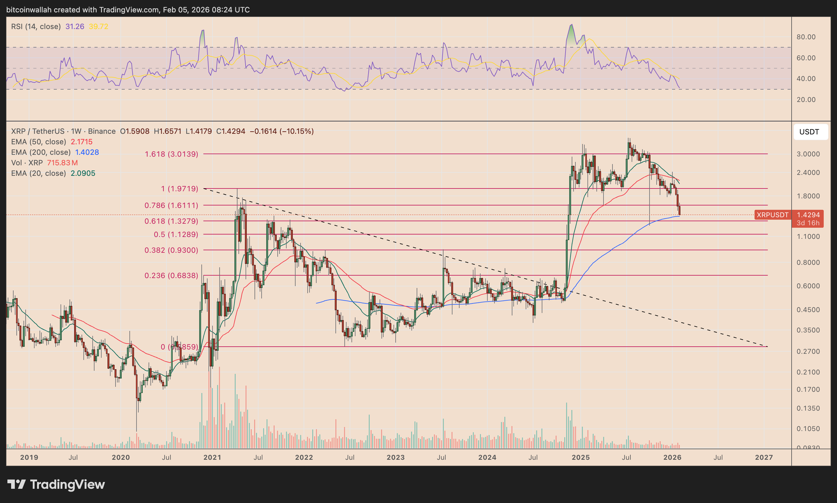 On the weekly chart, XRP is testing a critical confluence zone where the 200-week EMA aligns with the 0.618 Fibonacci retracement near $1.40–$1.43. This area has historically acted as a cycle-defining support.