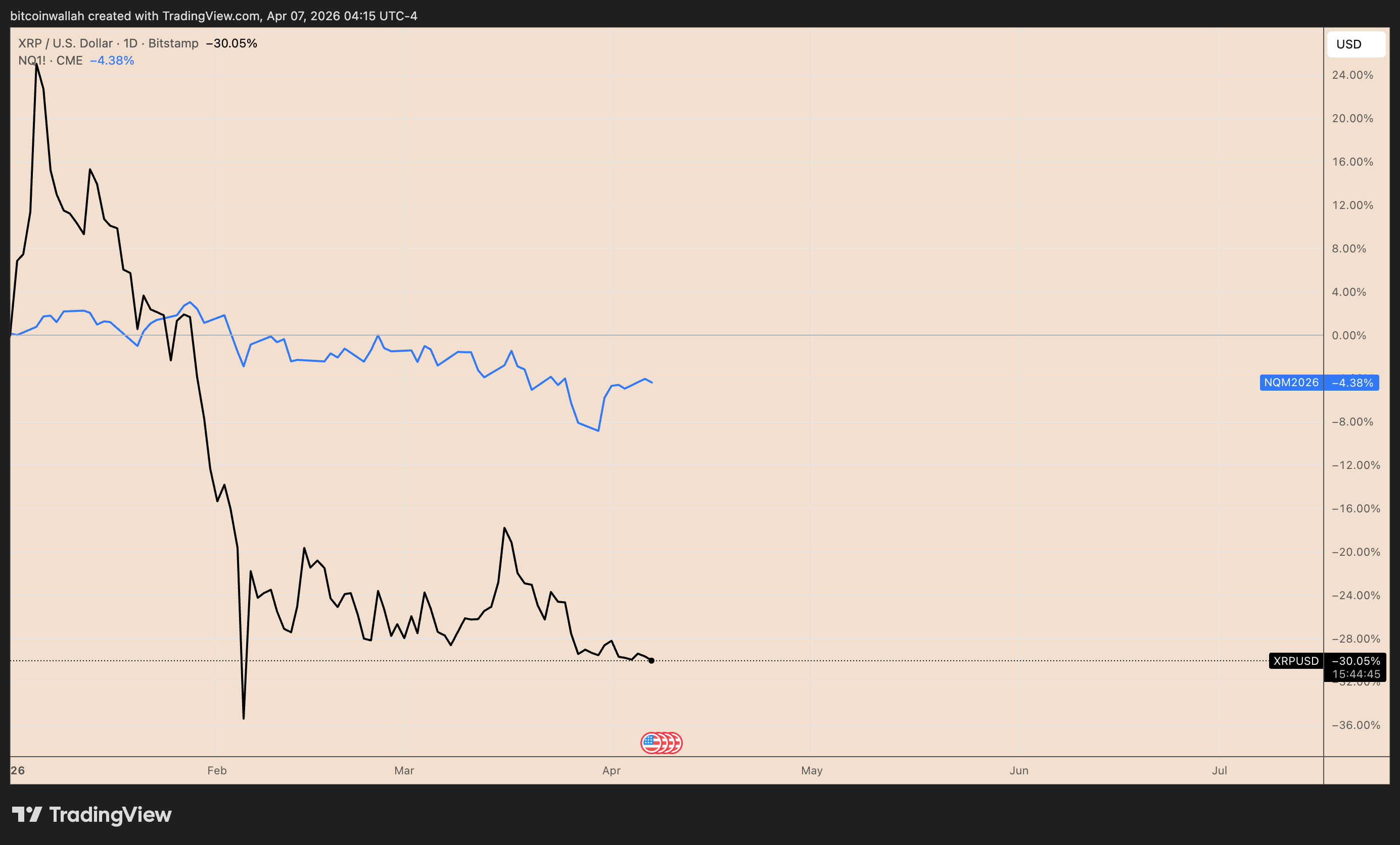 The XRP/USD exchange rate was down 1.14% intraday and 3.79% from its weekly high, while trading for as low as $1.30 on Tuesday. Its declines accompanied whipsaw moves elsewhere in the risk market, with Nasdaq futures slumping 0.46%.