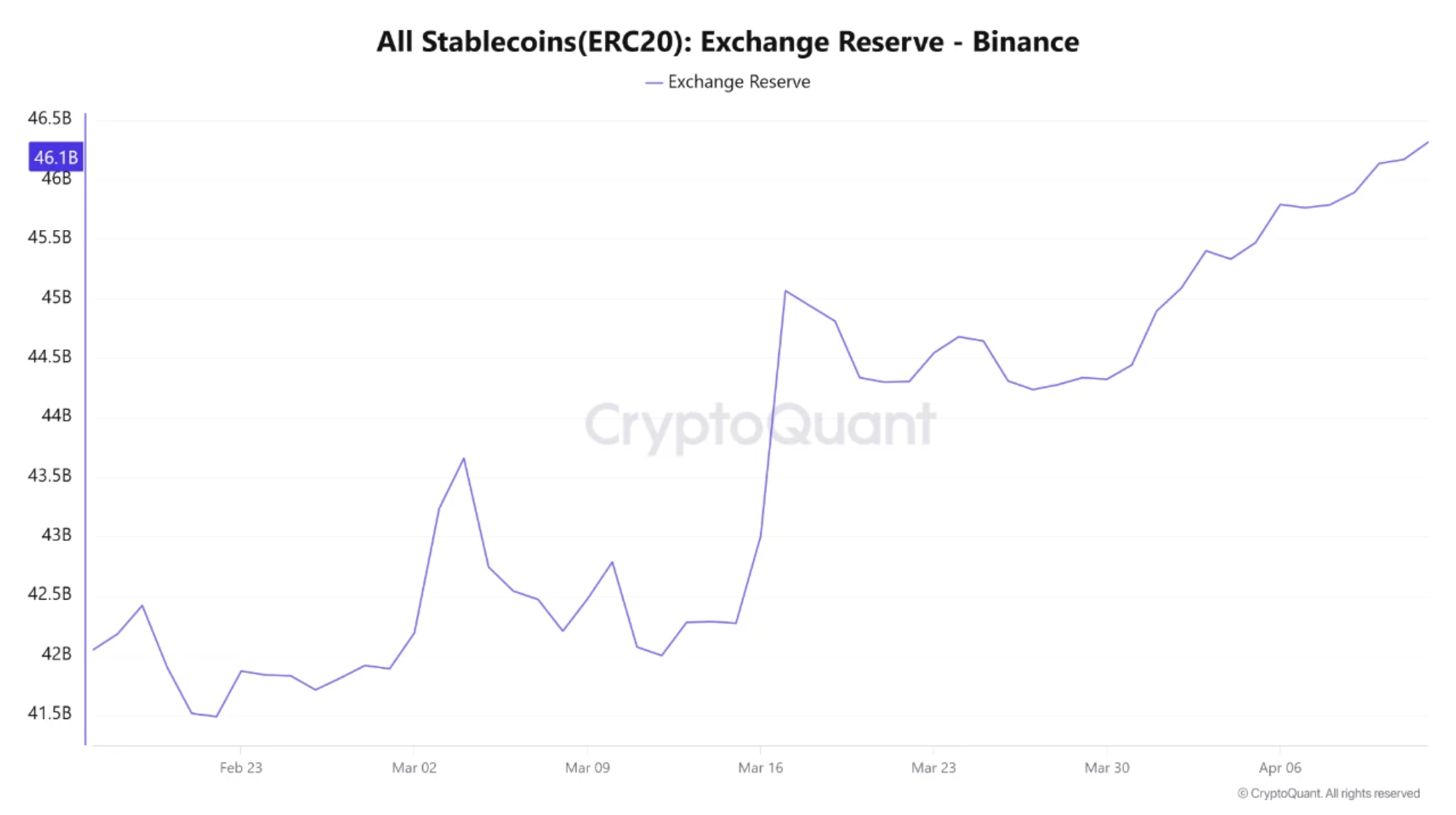 Binance’s ERC-20 stablecoin reserves have climbed to about 46.3 billion, their highest level since early February, after rebounding by roughly $5 billion from the cycle low.
