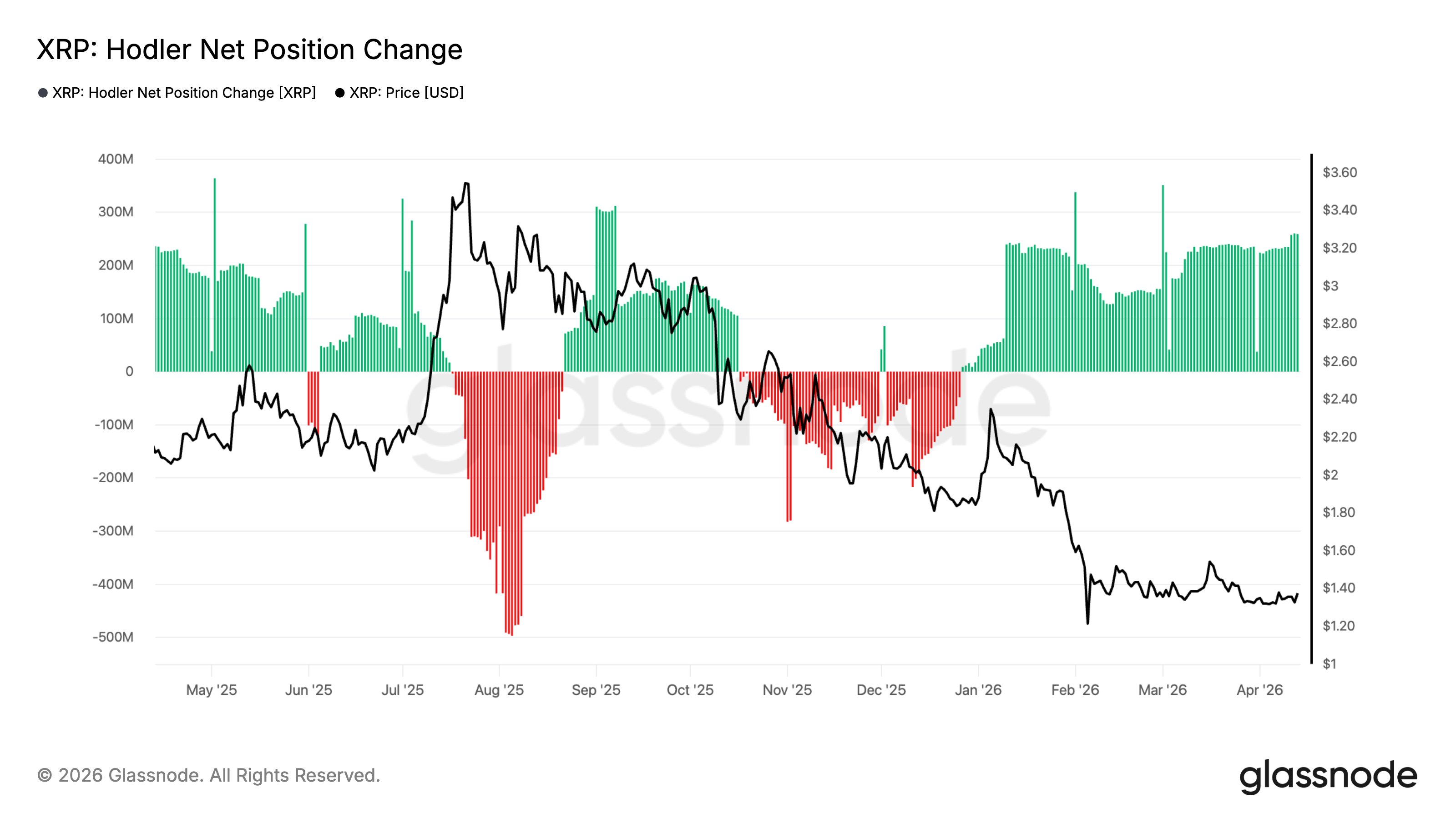 The Hodler Net Position Change metric has remained mostly positive for months, with net additions often holding in the 200 million to 300 million XRP range even as XRP traded near the $1.30 area.