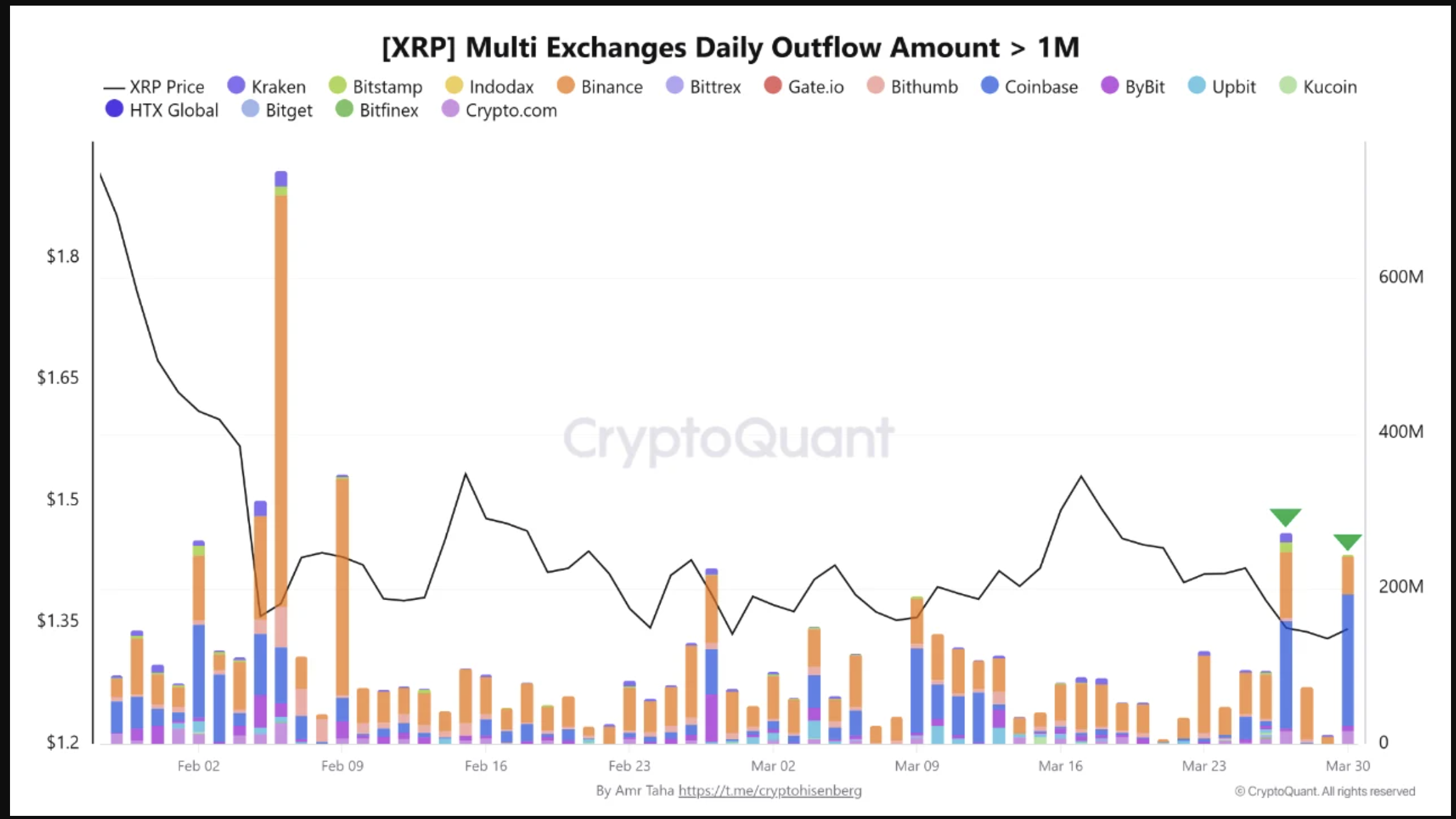 Activity picked up again on March 27, when Binance saw 85 million XRP in large outflows worth about $113.9 million, while Coinbase recorded 138 million XRP worth about $184.9 million.