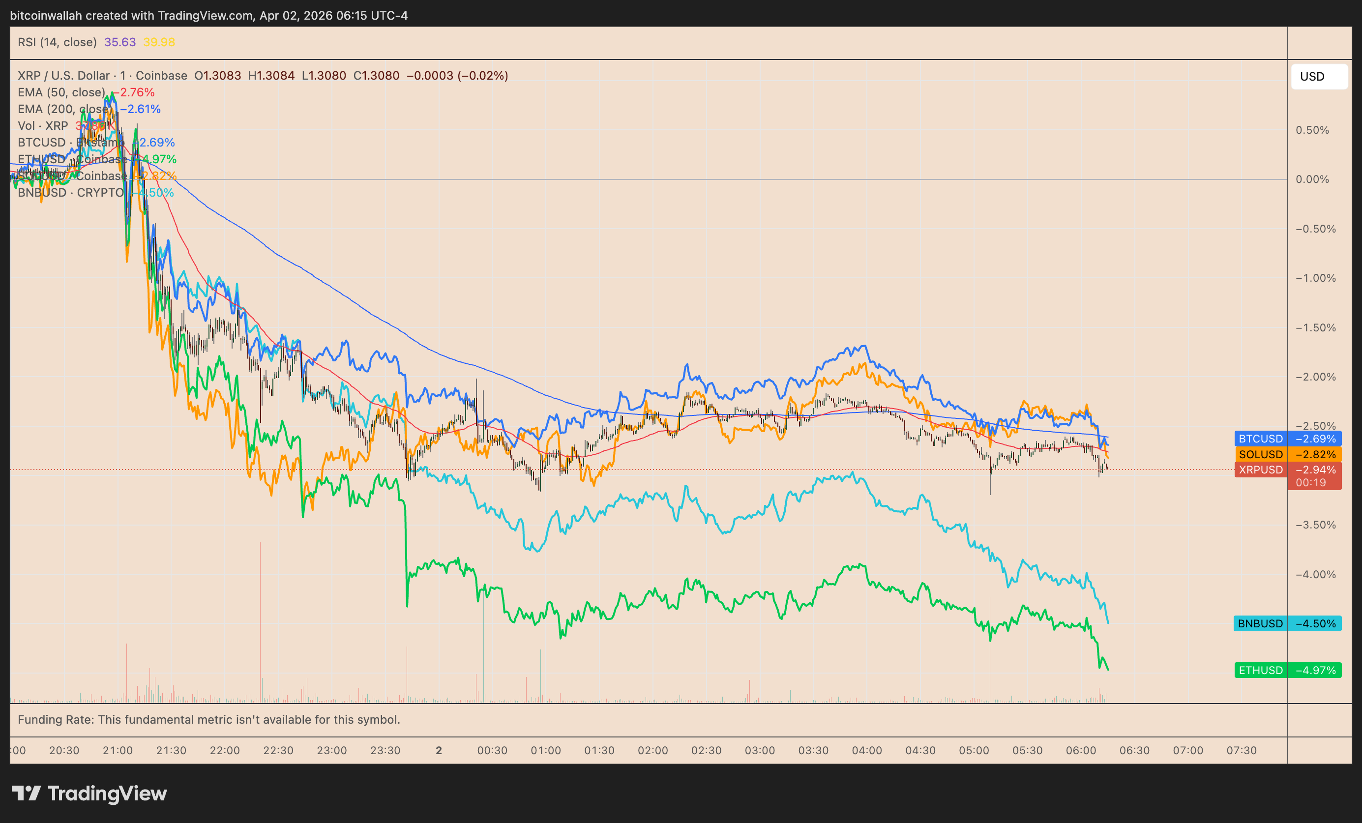 XRP traded between $1.30 and $1.36, remaining within its recent consolidation range but moving lower with the broader market.