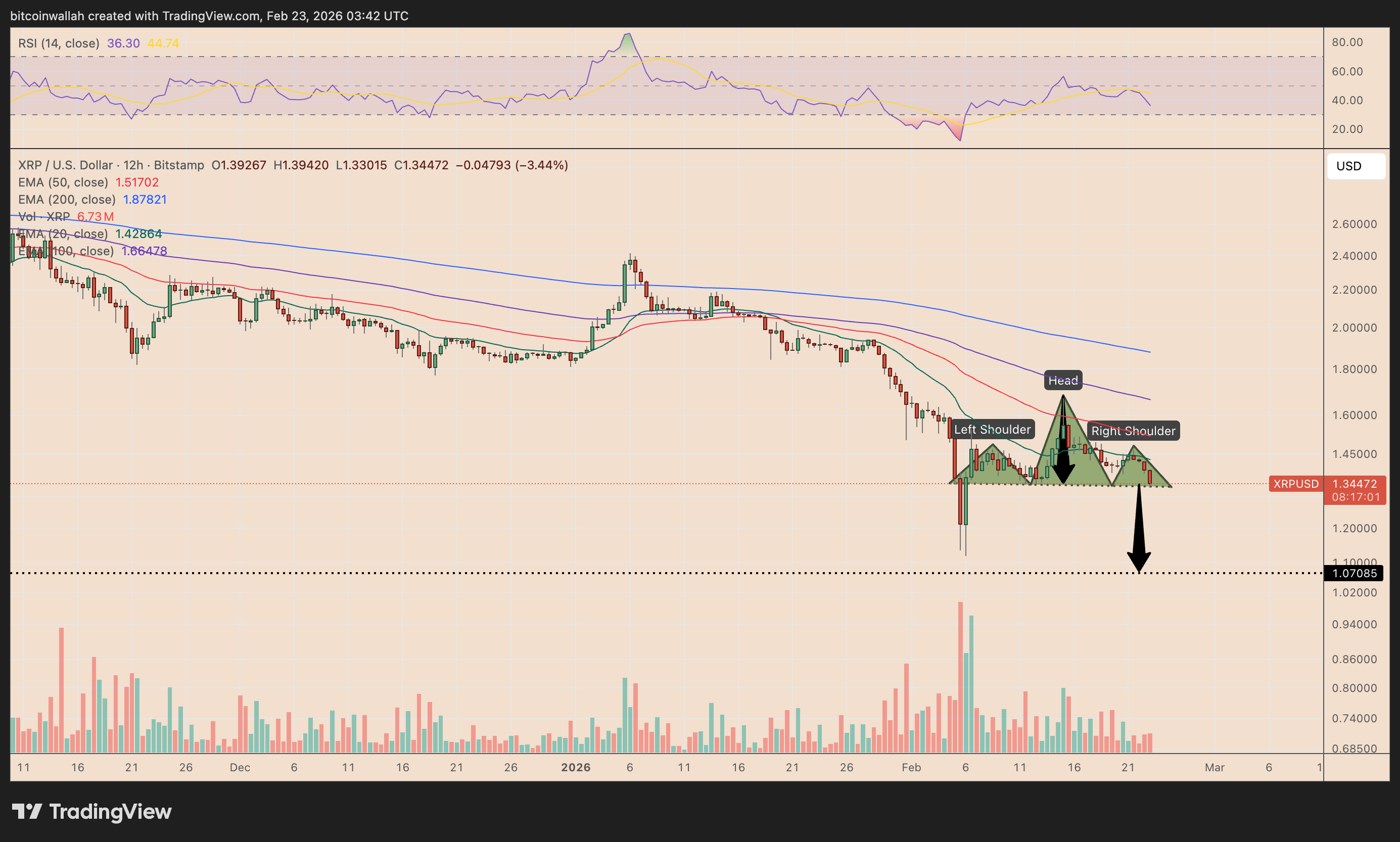 XRP has printed a head-and-shoulders topping pattern: a left shoulder near the mid-$1.40s, a head spike into the $1.60–$1.70 area, and a lower right shoulder.