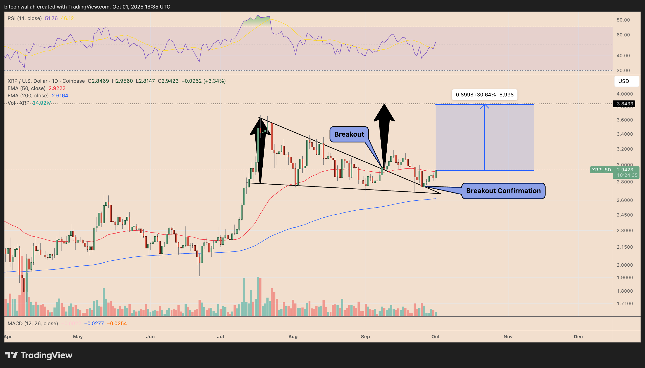 XRP (XRP) may be preparing for a strong October after confirming a breakout from a classic falling wedge pattern, one that could propel its price higher by more than 30%.