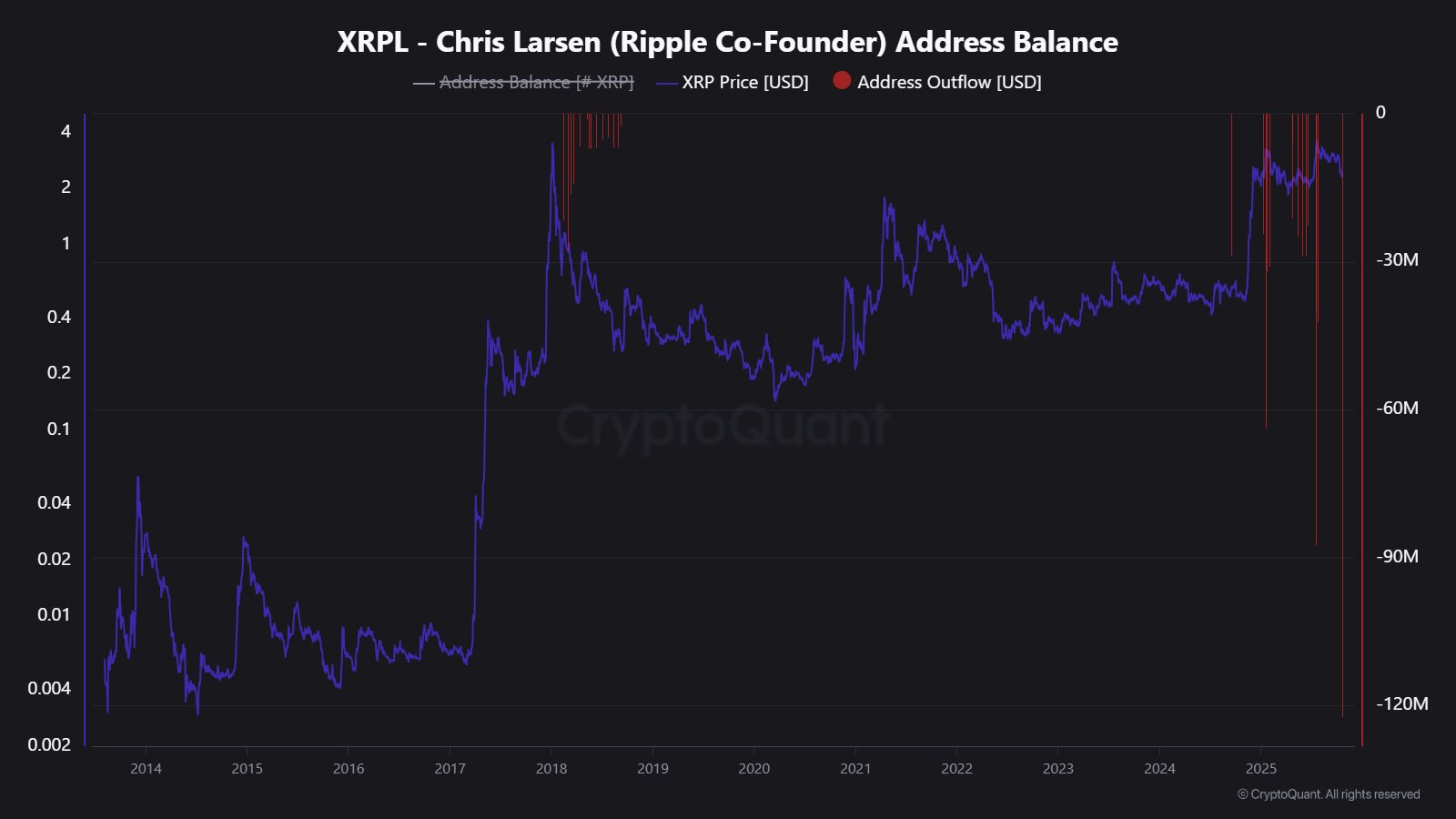 On-chain data from CryptoQuant shows a massive $120 million outflow from Larsen-linked wallets, aligning with a 2.50% decline in XRP’s price on Tuesday.