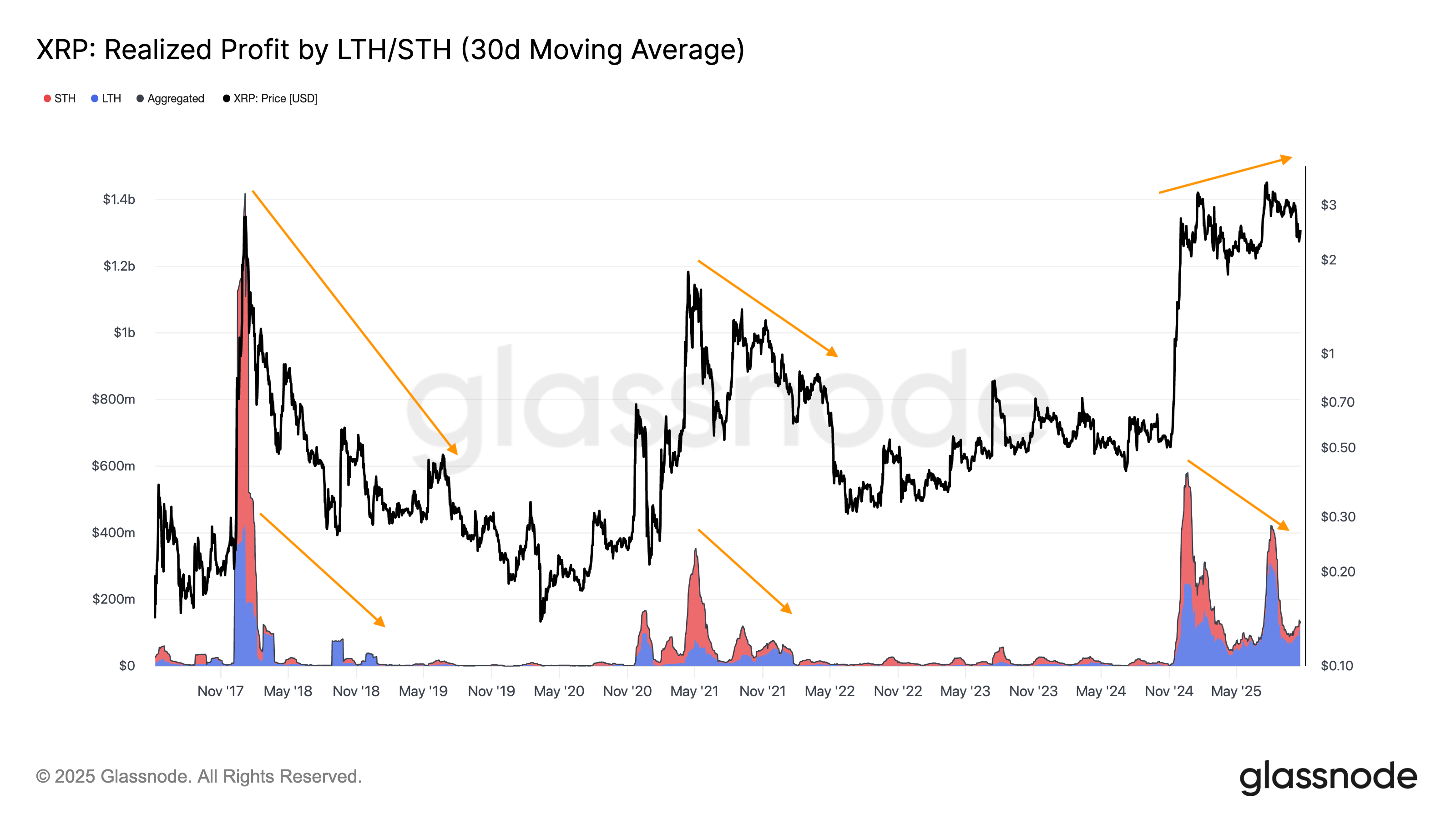 In past cycles, XRP peaked when realized profits surged; this time, they’re cooling, suggesting that most speculative sellers have already exited, while conviction among long-term holders is growing.