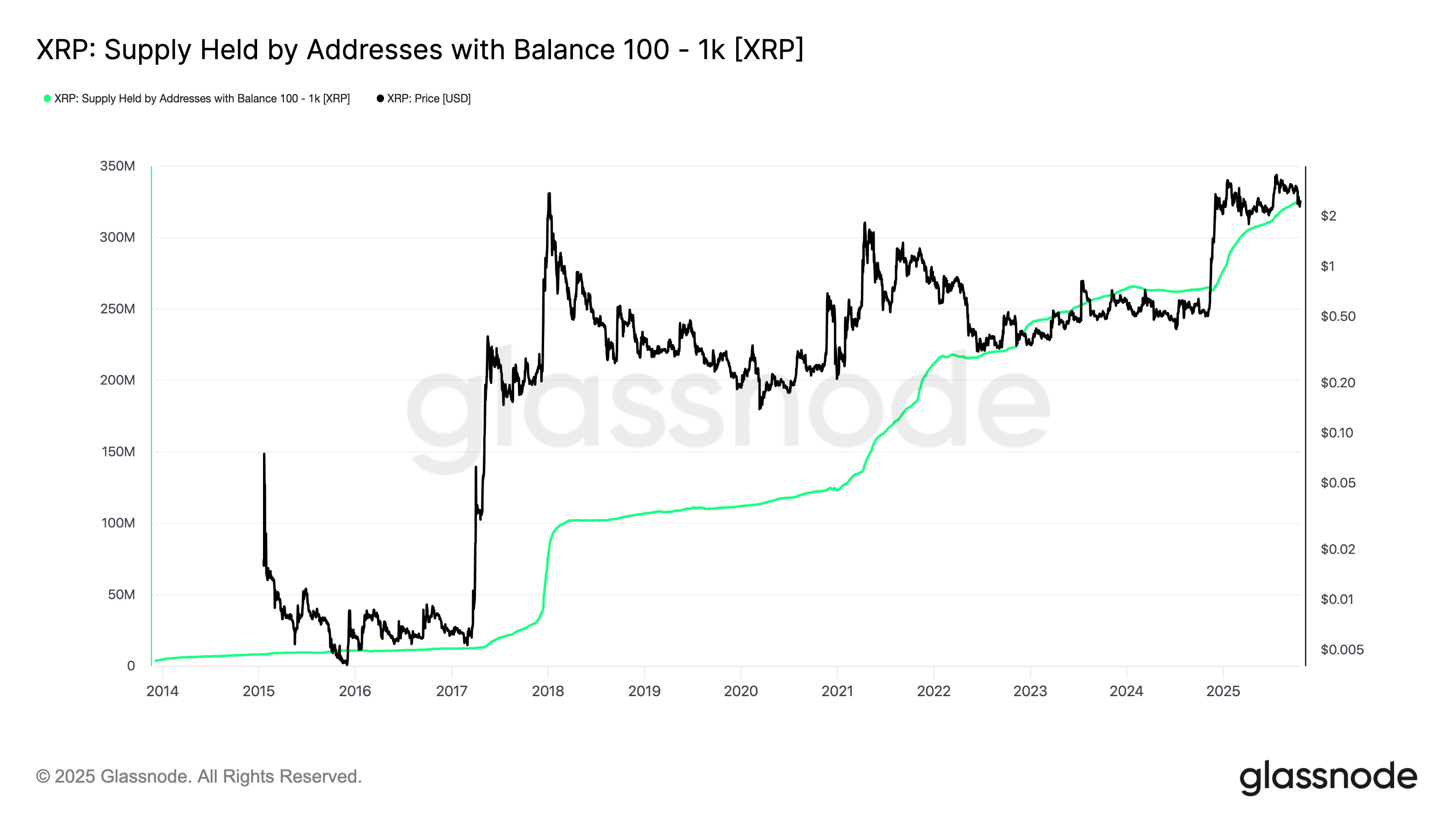 Whales are listening. As of Tuesday, XRP addresses holding over 100 tokens were rising in numbers. That is despite the Ripple-backed coin trading about 35% lower from its multiyear high, established in July.