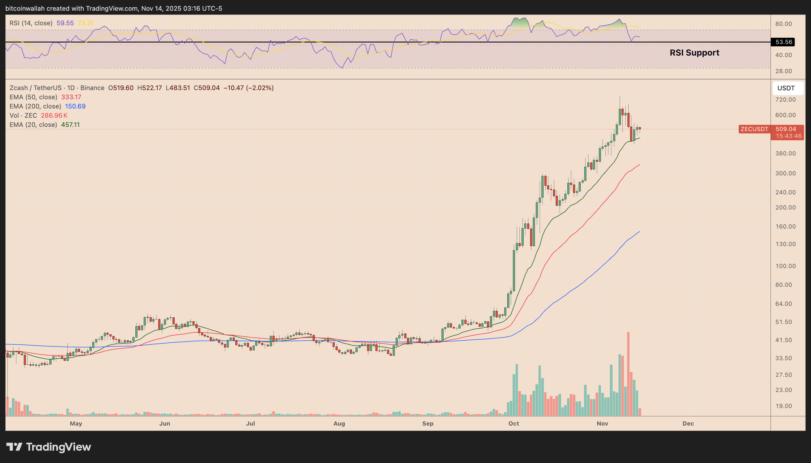After peaking near the $750 region, ZEC has traced a rounded top, followed by a failed recovery attempt that now resembles the “handle” portion.