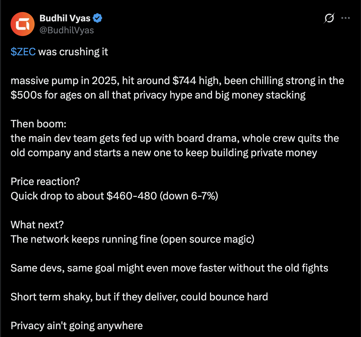 As noted by Budhil Vyas, the resignations do not imply an abandonment of Zcash’s mission. The same core developers are expected to continue building privacy-focused technology under a new structure, while the network itself remains fully operational and open source.