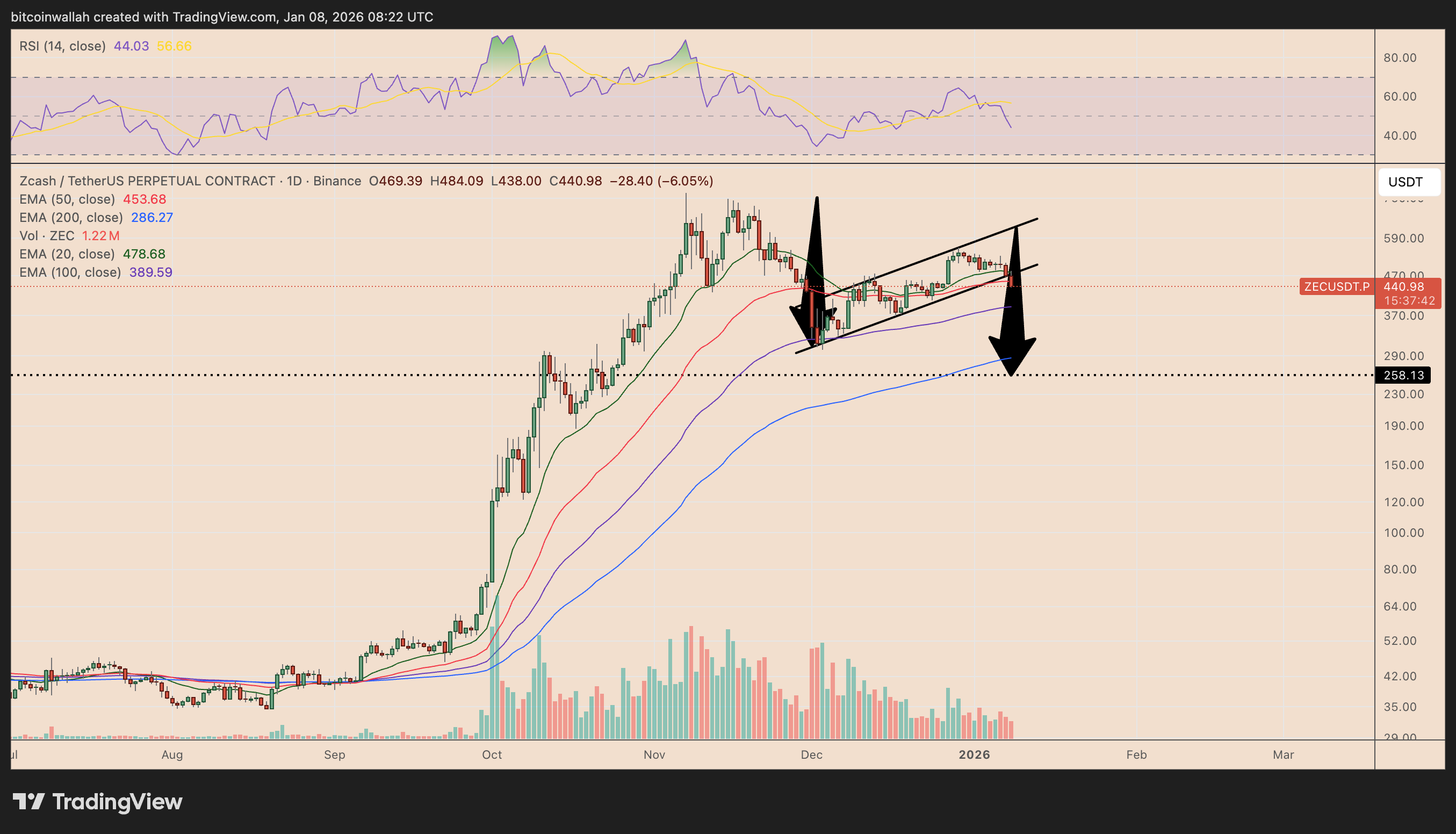 From a technical standpoint, Zcash appears to be breaking down from a short-term bear flag on the daily chart, reinforcing downside risks after the latest sell-off.