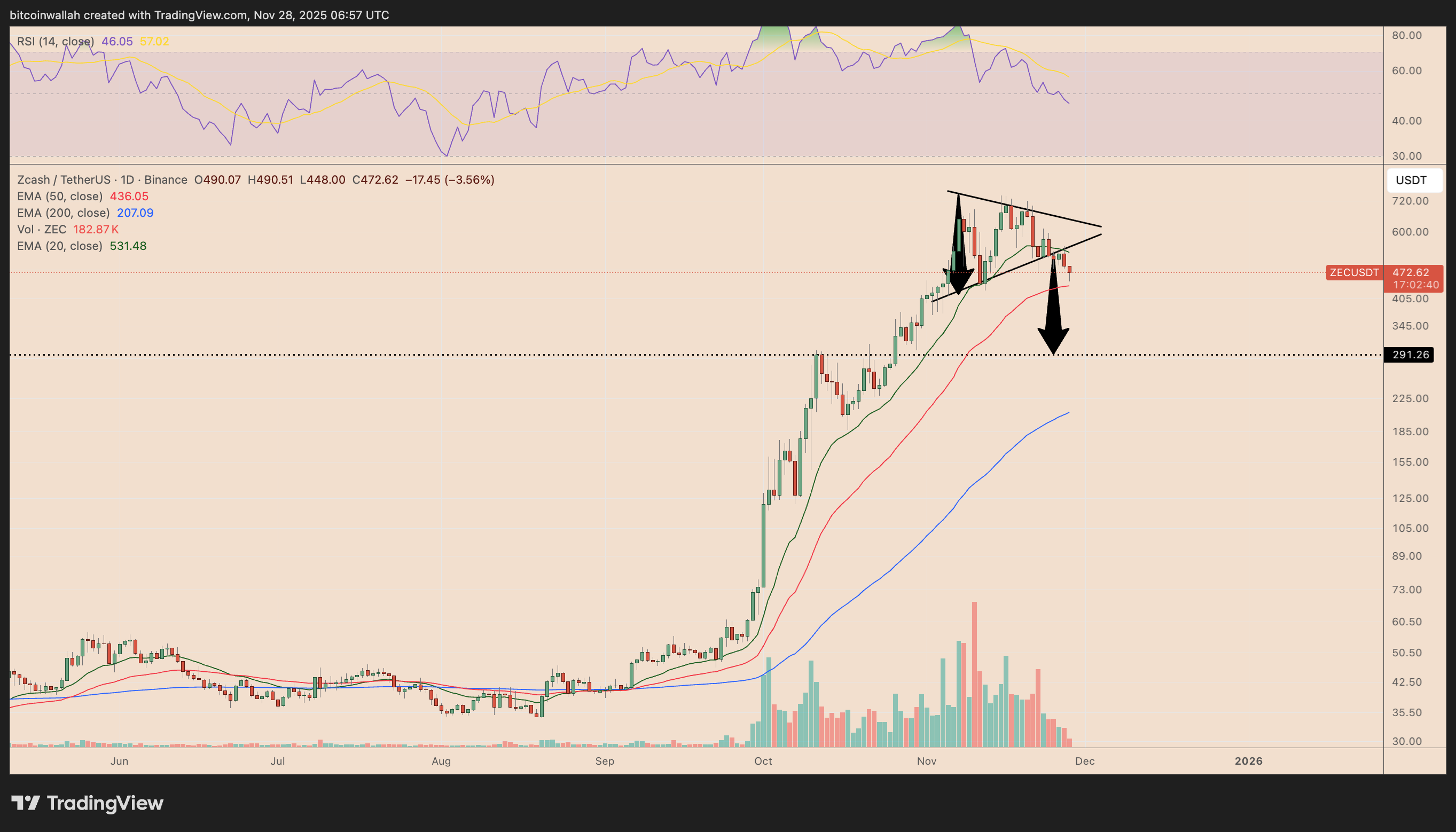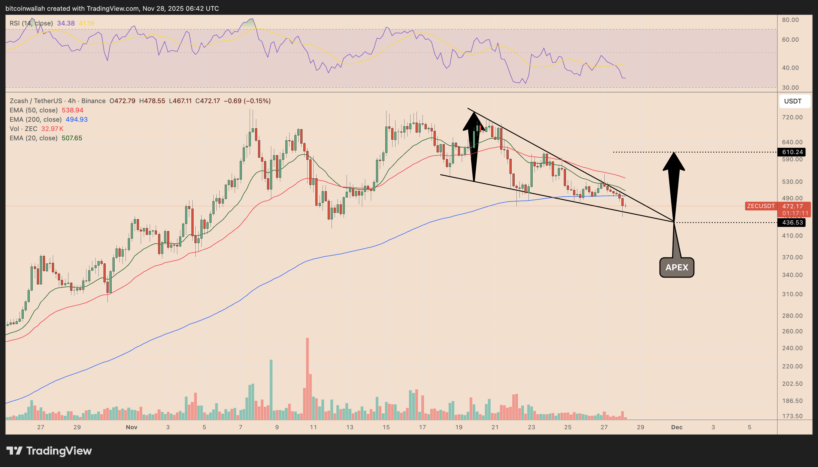 Zcash price has been in a steady series of lower highs and lower lows since topping near $720 earlier this month. That decline is now compressing into a narrowing range, with price gravitating toward the wedge’s apex around $436.