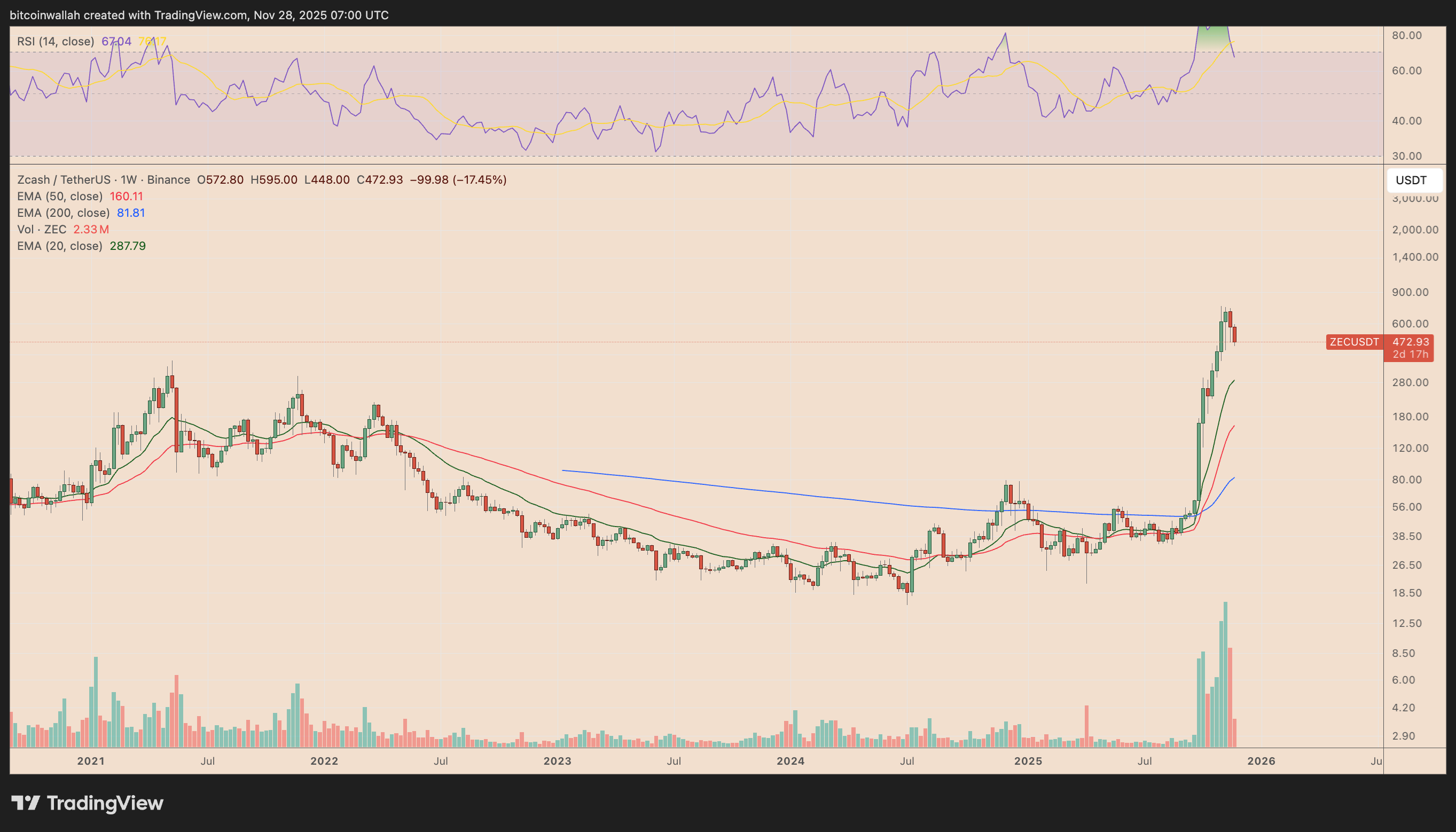 Interestingly, the symmetrical triangle’s downside target aligns perfectly with ZEC’s 20-week exponential moving average (20-week EMA, represented by the green wave) in the chart below.