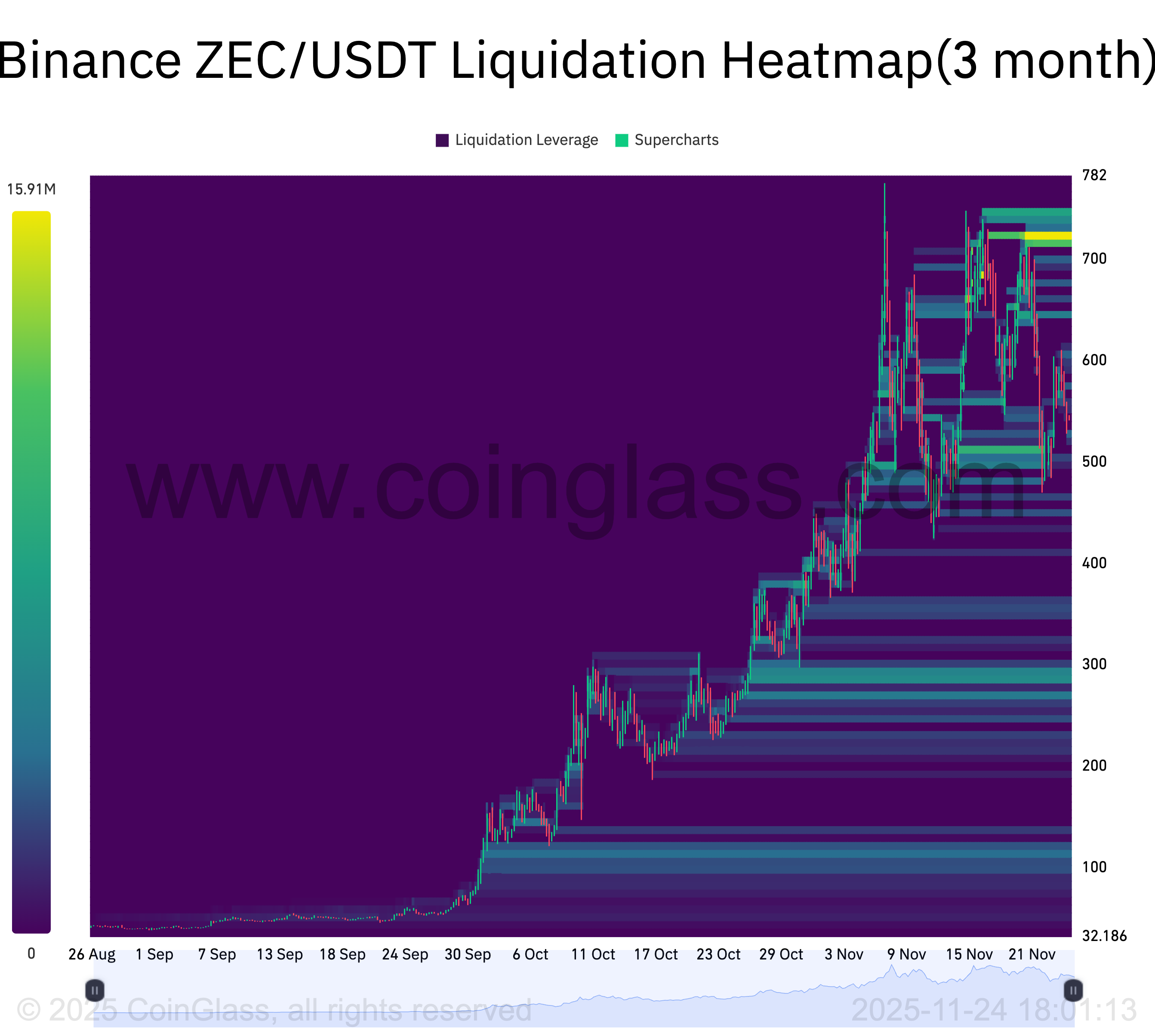 Liquidation data shows a major active short-liquidation cluster near $726, currently holding around $15.91 million in leveraged short positions. This is now the largest live short-liquidation pocket on ZEC’s three-month heatmap.