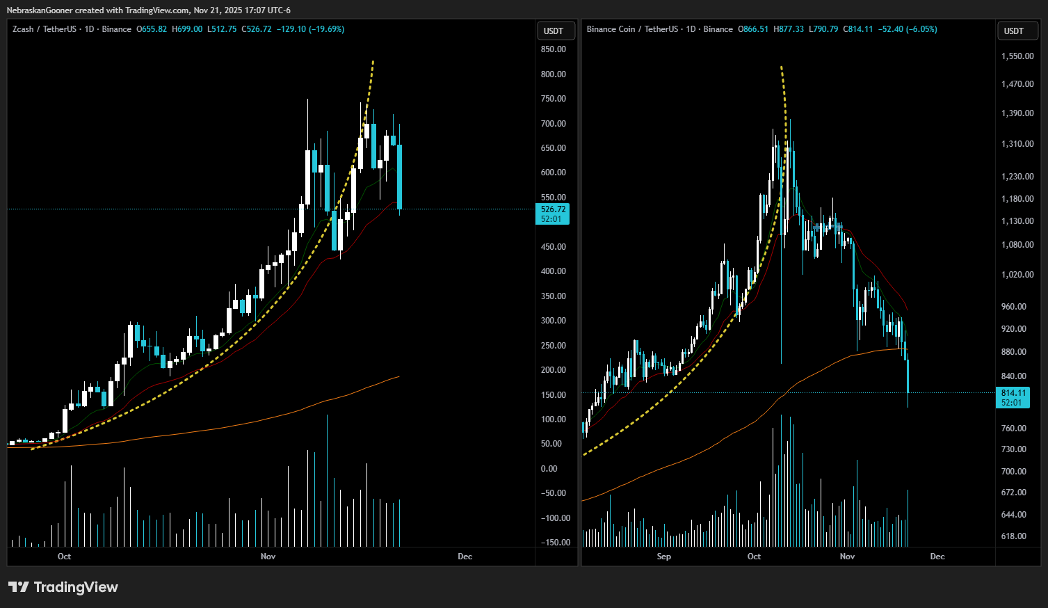Zcash (ZEC) is replicating the same parabolic structure BNB (BNB) printed before its major breakdown, according to charts shared by trader NebraskanGooner.
