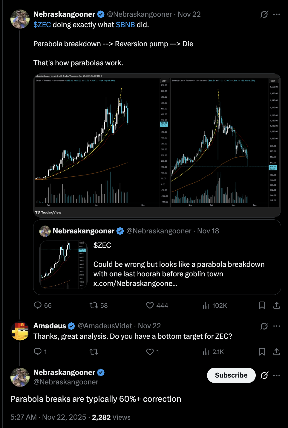 For ZEC, this means that the closest meaningful demand zone is situated far below the current price. NebraskanGooner anticipated the token to decline by 60% from its current price levels, as is typically the case with parabolic curve breakdowns.