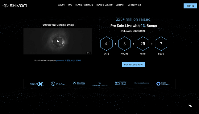 The project has also partnered with the government of India’s state of Andhra Pradesh to sequence up to 60 million local people, which would kick off with a pilot study once the token sale is over. In addition, Shivom has partnered with Genetic Technologies Limited for the development of predictive genetic tests and the use of accredited laboratories.