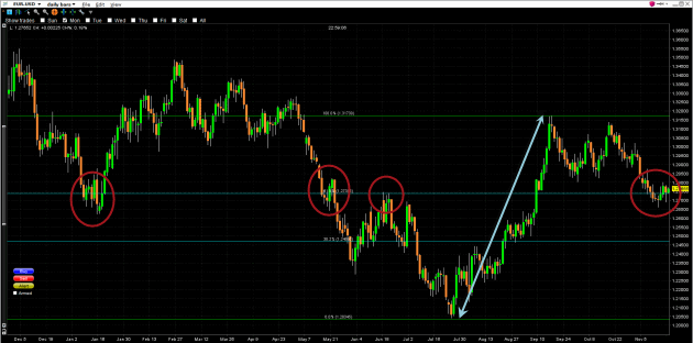 A retracement takes place when a trend has already been established. Fibonacci retracement isn’t possible in consolidating markets in other words. Regarding the recent trading action of EUR/USD, I am assuming that the long-term downtrend of the forex pair has ended in July and an uptrend is being developed ever since. Therefore, I will use the low point of July (1.2034) and the recent high one of September (1.3173). Connecting those two points with the Fibonacci line starting from July’s low (white line in the graph), the key Fibonacci retracement levels (38.2% and 61.8%) are drawn automatically by the charting software. Depending on your trading software, you may be able to draw additional levels like the 50% one.