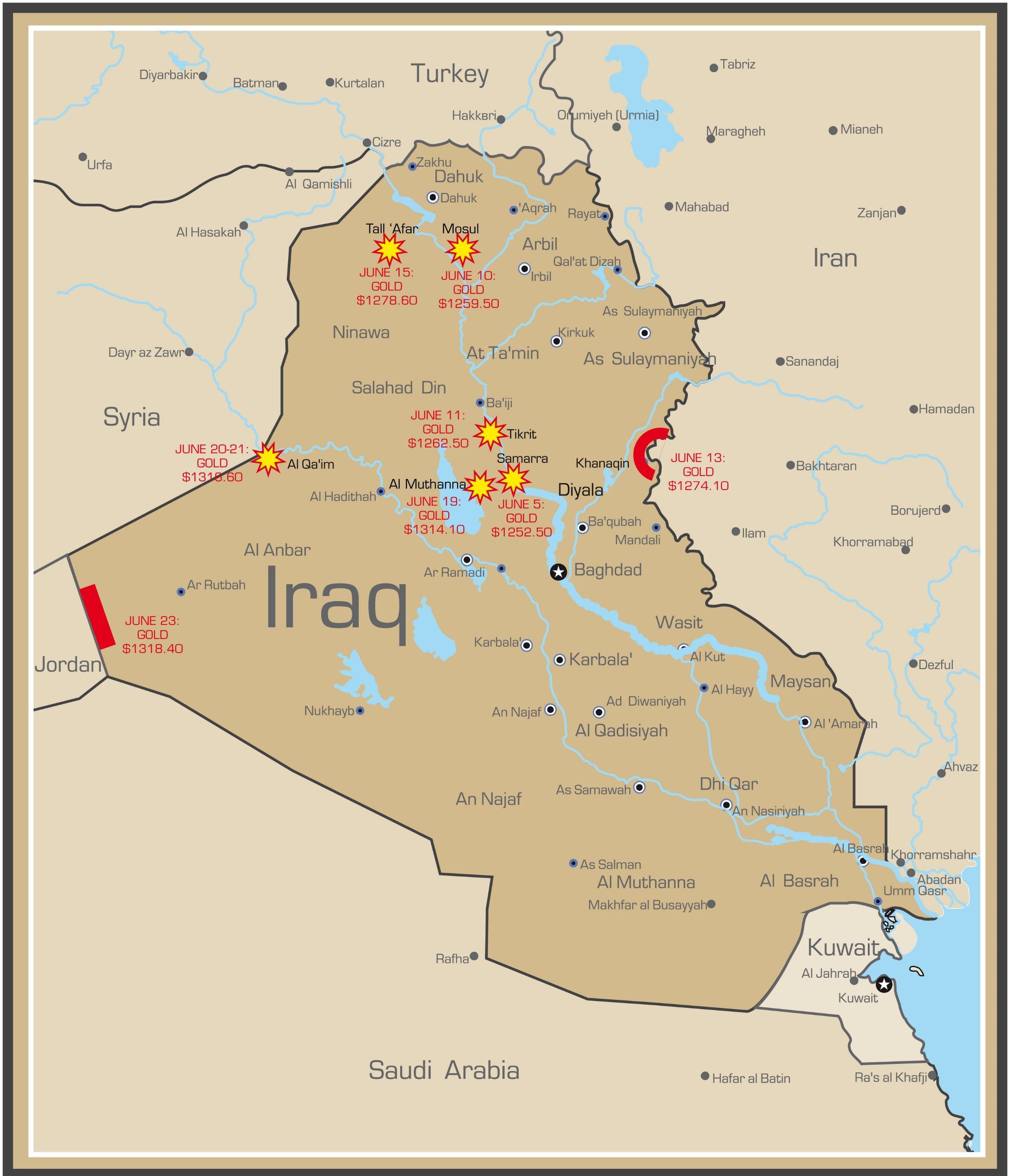 As ISIS has subjugated hundreds of miles of territory and much of Iraq’s Western border, the price of gold has risen in lock-step with their advance. Since ISIS forces attacked Samarra back on June 5th, gold is up almost 5 1/2 %. It jumped over 2% with the capture of Tal Afar, its airport, and the purported execution of several hundred Iraqi soldiers.