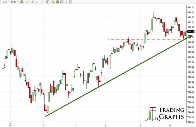 Traders who bought SPY stock yesterday or are looking to buy today after the price bounced at the support level will most likely submit a stop loss order exactly below that specific support level. If the stock price of the ETF fails to resume the uptrend and collapses, the stop loss order will automatically be transmitted as soon as $142.50 is hit, minimizing the risk.