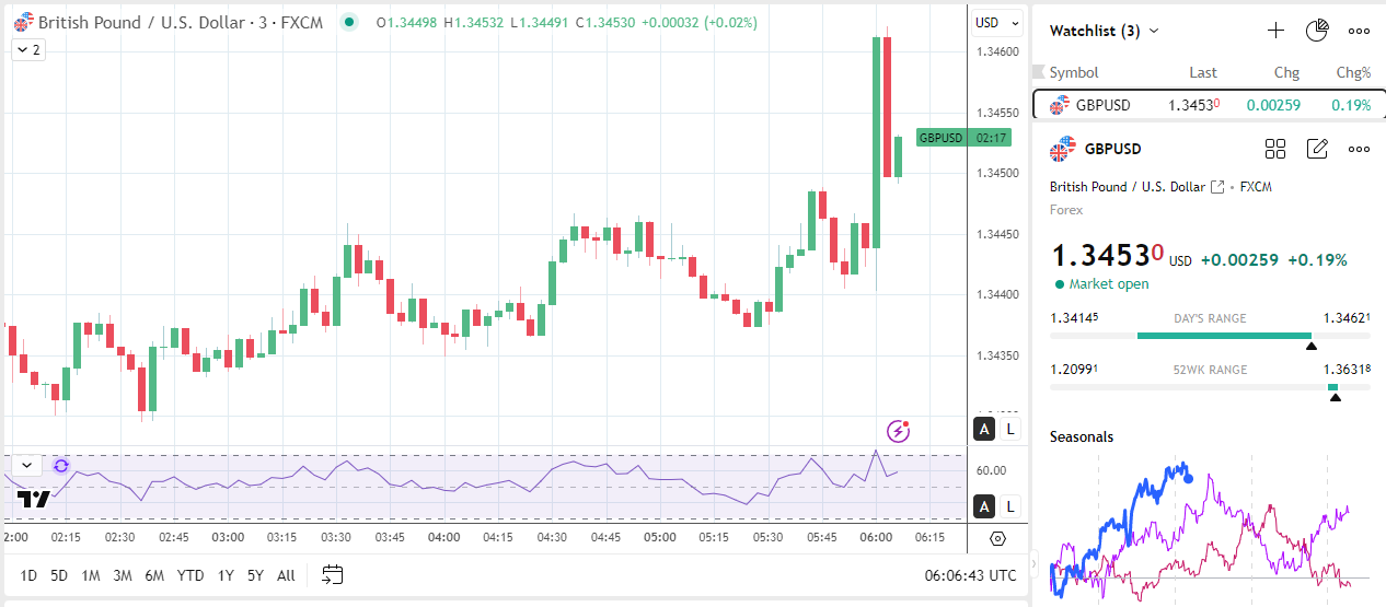 Ahead of the inflation report, the GBP/USD dipped to a low of $1.34145 before climbing to a high of $1.34489. Following the report, the pair fell to a low of $1.34403 before surging to a high of $1.34621.