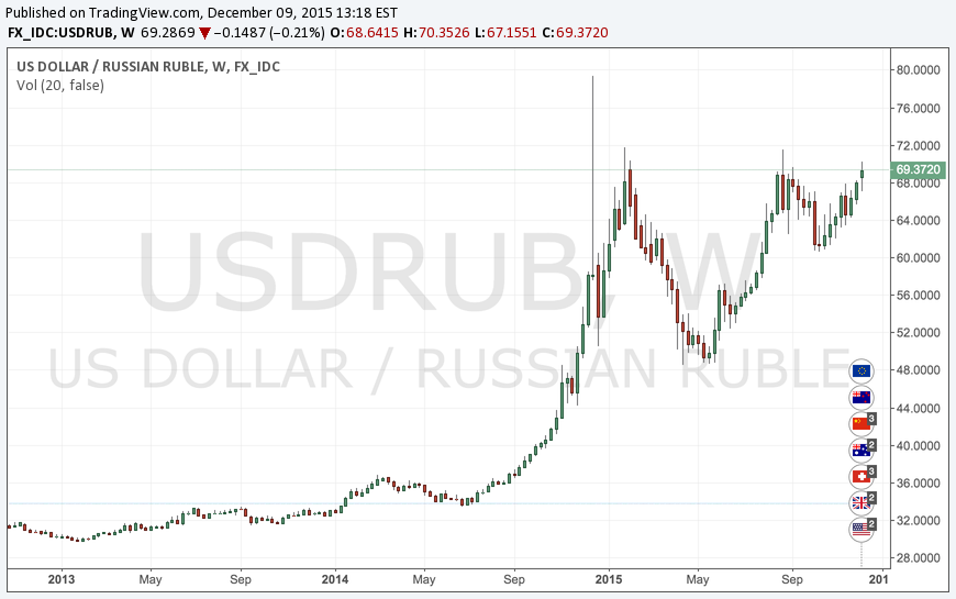 When you are considering investing in Forex, the USD/RUB could seem a viable option as 2015 volatility has been quite high and this pair can actually deliver great results over a relatively short period of time. We predict the price of oil to actually drop further and the same happen to natural gas prices and this should trigger the price of the USD/RUB to drop to around 72 rubles per dollar. This is an important level to watch out for, however such a rate could also trigger another intervention. For this reason it is suggested to actually go short on USD/RUB once the price passes the level of 72 rubles per USD.
